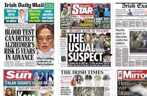 How Ian Bailey's death will impact the Garda investigation into Sophie Toscan du Plantier's murder, Storm Jocelyn, and a new law that would force supermarkets to accept cash are among Tuesday's front page stories.