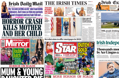 Meanwhile, the Irish Daily MailIrish Daily Mirror and Irish Daily Star all lead with a fatal collision in Co Mayo on Tuesday, in which a woman and girl were killed.