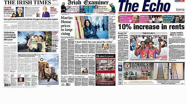 The Irish Examiner leads with a piece on prospective homeowners facing another three to four years of spiralling house prices, just as the cost of renting a home in cities is soaring to record levels.